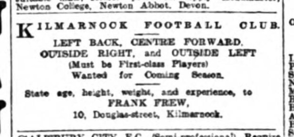 May 28, 1906 (Athletic News: May 28, 1906) Kilmarnock, new players, Frank Frew, 10 Douglas Street, left back, centre forward, outside right, outside left. X