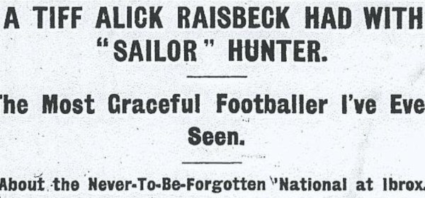 May 8, 1915 A tiff Alick Raisbeck had with John “Sailor” Hunter. The most graceful footballer I’ve ever seen. About the never-to-be-forgotten ‘National at Ibrox.