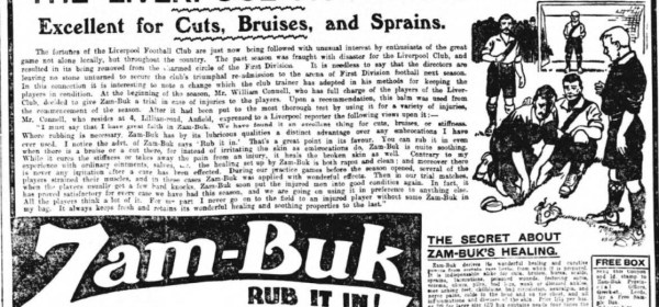 November 2, 1904 An advertisement of the healing balm “Zam buk” from 1904 spinning around how the trainer of Liverpool F.C., William Connell, always have