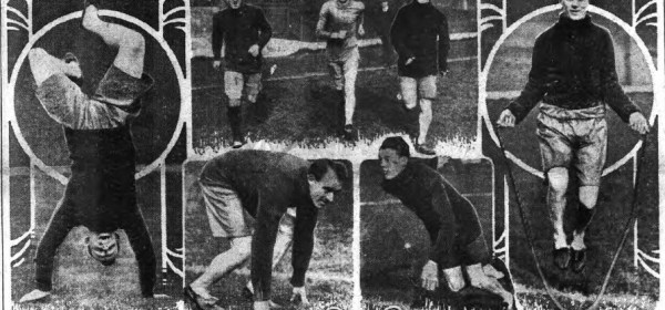 Monday, October 30 – 1922 (1) Dick Johnson’s novel idea of leg exercise; (2) Donald Mackinlay, John McNab, and Harry Chambers off for a sprint;