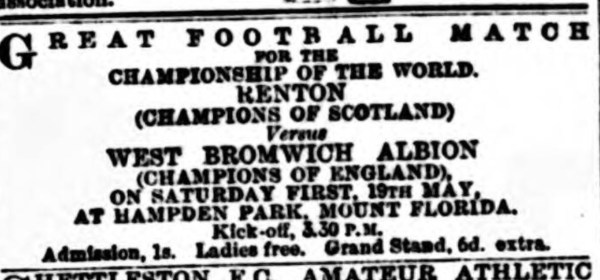 May 19, 1888 Match: Friendly, at Hampden Park, kick-off: 15:30. Renton – West Bromwich Albion 4-1 (1-0). Attendance: 6,000. Referee: Mr. Sinclair (Irish FA). Renton