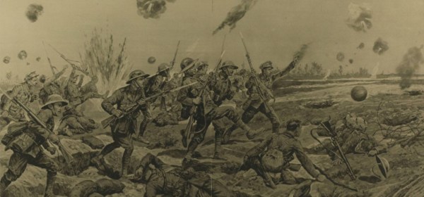 July 29, 1916 “Kicking footballs towards the German trenches under a hail of shells.” “On through the hail of slaughter… They drive the trickling ball.”: